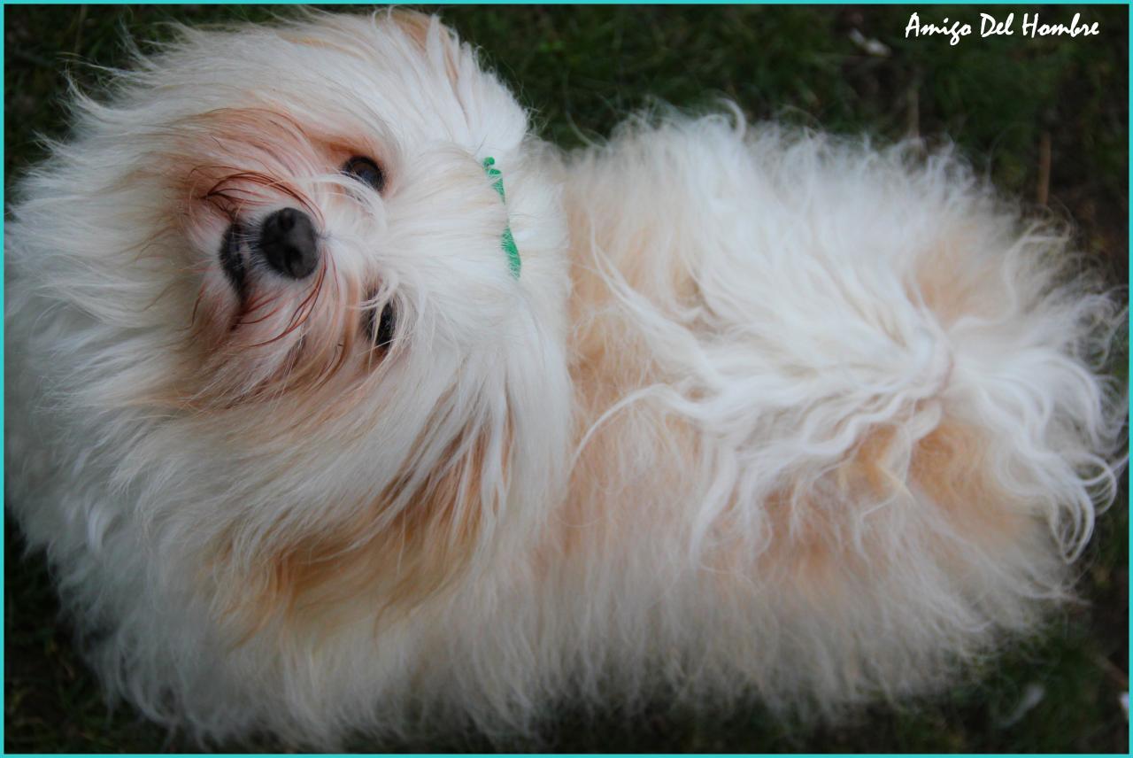 Elouna, nous l’avons beaucoup attendue ...Elle est issue de deux lignées de champions : une lignée française et une lignée hollandaise. Elouna c’est la joie de vivre et la gaieté ! Elle s’est intégrée ici comme si elle y était née ! Très facile à vivre, elle aime tout le monde et adore les rencontres, avant tout elle est gentille et douce . C’est notre miss Bisous ... Sa robe crème et blanche aux reflets fauves lui donne un magnifique manteau marbré soyeux et très fourni ....mais très facile à brosser car son poil n est pas frisé ! C est une belle havanaise très bien construite qui se déplace avec un très bon mouvement joyeux et gracieux... C'est une copine de jeux inépuisable .... Tous nos havanais s’entendent à merveille ! Elouna est très joueuse et sait tendre des pièges à ses copains havanais ! Elle se cache et bondit sur eux au moment propice !!!! Elle salue nos retours avec quelques aboiements de contentement comiques !C’est une princesse douce dans sa façon d’être avec nous et..... qui a l’art de se transformer en TRES peu de temps en une jardinière accomplie "ornée de bottes" terreuses à souhait !!!