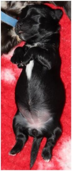 Pour apprécier les écarts de taille ! Je précise que le "gros"mâle de la portée a un poids moyen pour un bébé havanais, ceux d'Oshun étaient plus gros ! Les 4 plus petits sont vraiment minuscules ! Je serai curieuse de connaitre leur taille adulte .... Moins de 4 kg , c'est sûr mais peut-être moins de 3 kgs.... La lumière rouge : c'est le chauffage...